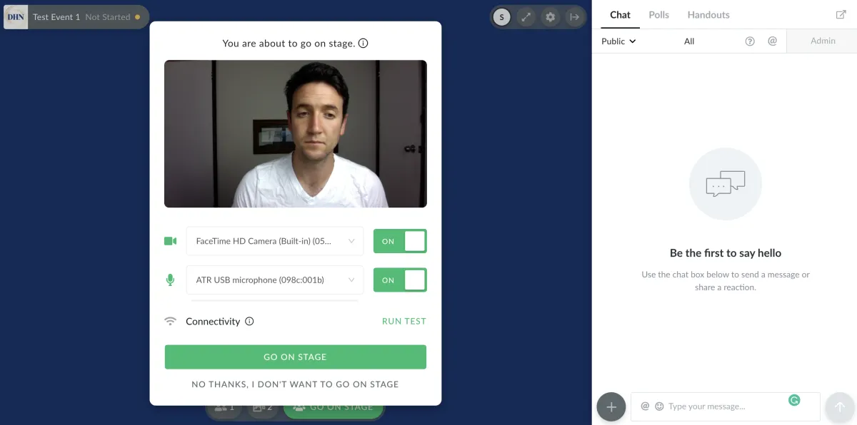 Select your camera and microphone from the drop-down menus then click Go On Stage
